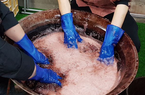 “泥染め”とは車輪梅の染料と鉄分豊富な泥田で染め上げる、