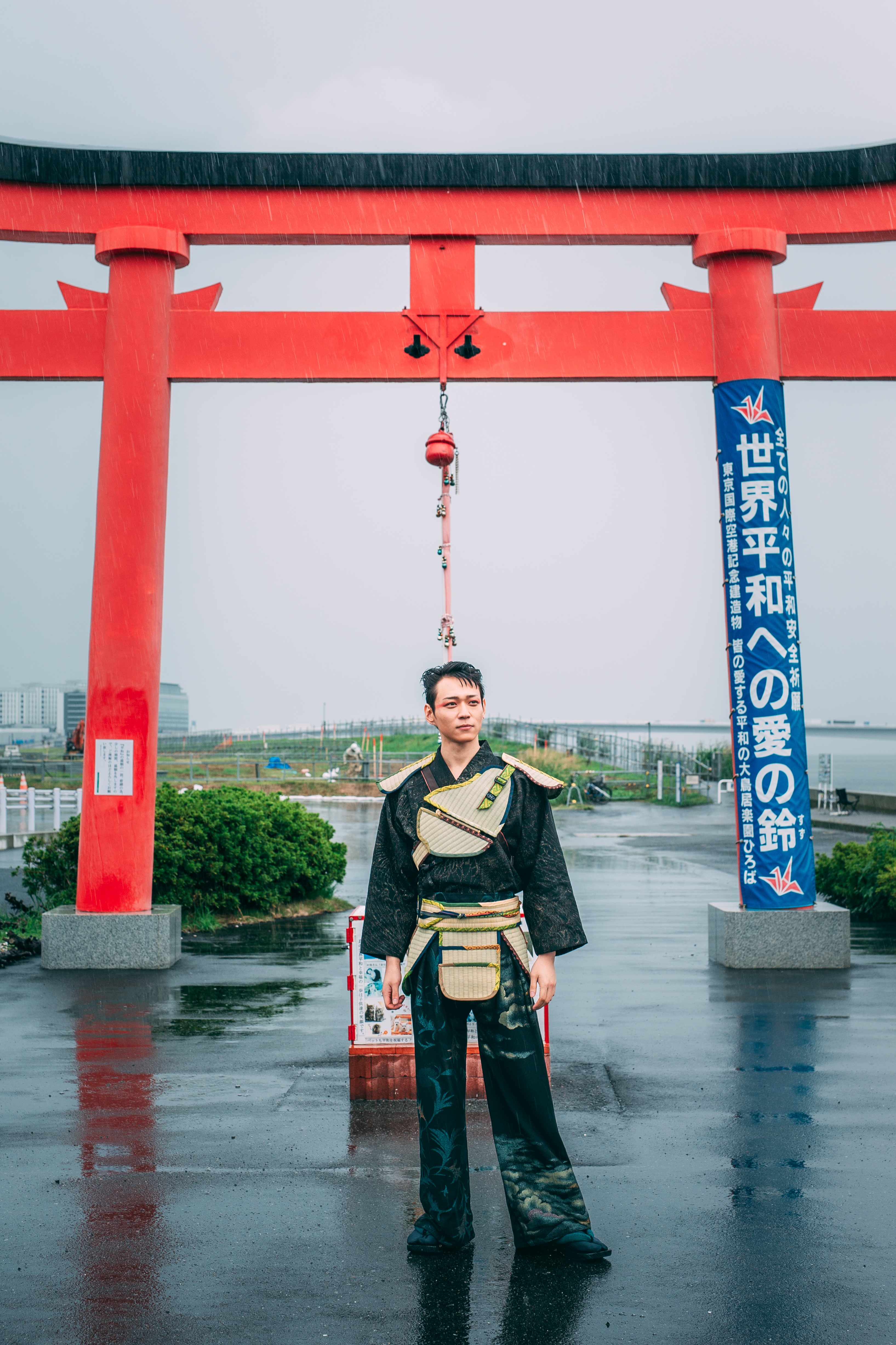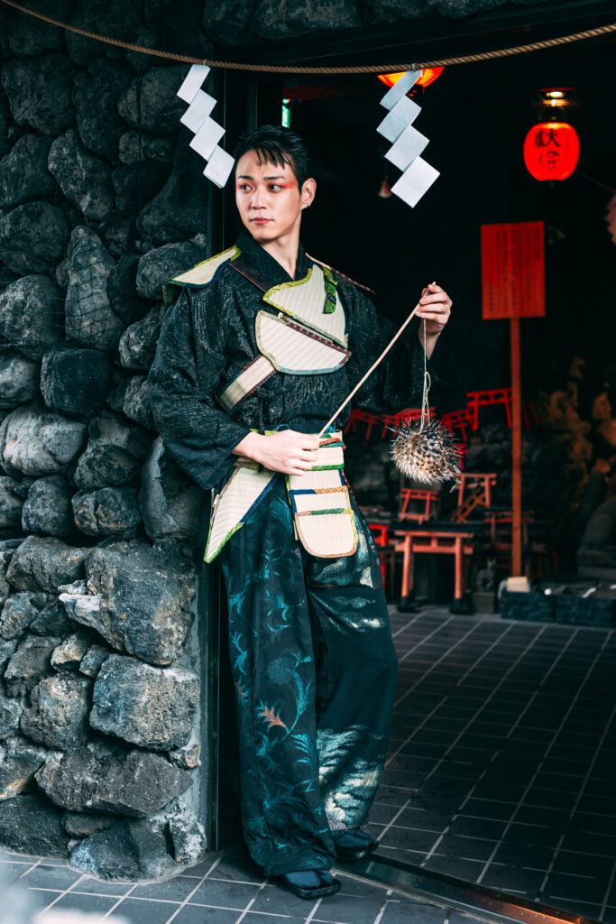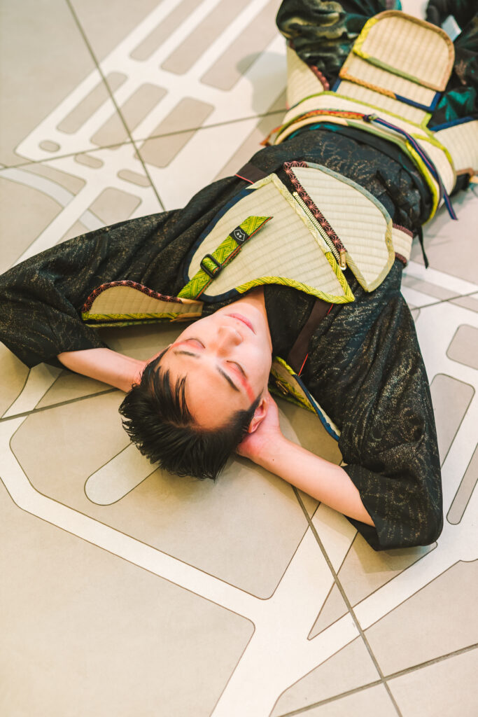 “Tatami-couture” is a garment made from discarded tatami. When worn, any place becomes a Japanese room: sitting turns it into a small tea room, lying down into a tatami space. Tatami was once foldable and portable, and in tea rooms the prohibition of weapons expressed a spirit of peace. Created in a place marked by memories of war, this work reflects on the past and questions possibilities for peace.